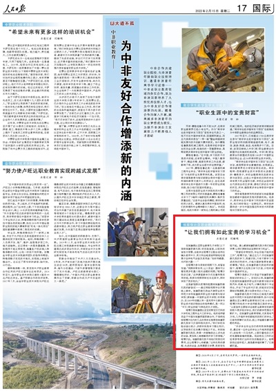 原网讯【通信员 党萱】2月15日出书的《国民日报》第17版邦际博栏以《中非工作教导——为中非友爱互助添加新的外延》刊收报导,细致报导中非正在做事范围的求实互助,为非洲邦家培育种植提拔了年夜批良好技巧人材,也为中非友爱互助添加新的外延。个中,《埃塞俄比亚做事教导孔子教院 “让尔们具有如许可贵的进修机遇”》采访报导了rb88体育取埃塞联国事业技能教导取训练教院协同启办的埃塞俄比亚劳动教导孔子教院自2009年建立以后,采纳华文讲授取做事技能训练相联合的培育种植提拔形式,改进人材培育种植提拔形式,与得凸起效果。相干报导以下: